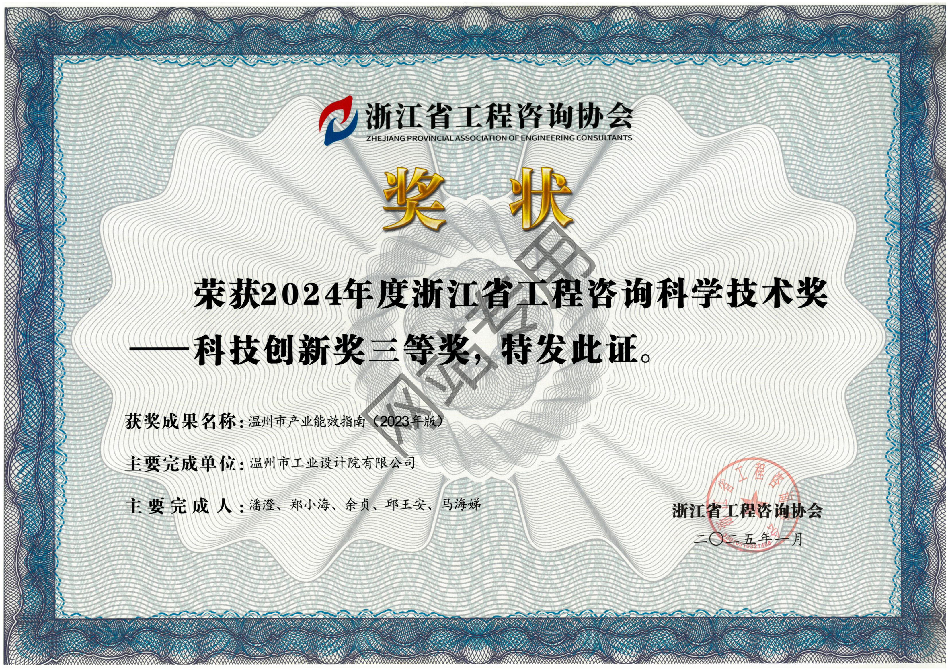 溫州市產(chǎn)業(yè)能效指南(2023年版)項目 2024年度省工程咨詢科學技術(shù)獎—科技創(chuàng)新獎獲獎三等獎