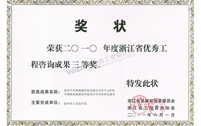 溫州中科新能源科技有限公司年產(chǎn)10萬噸生物柴油能源高科技項目 甌江杯一等獎