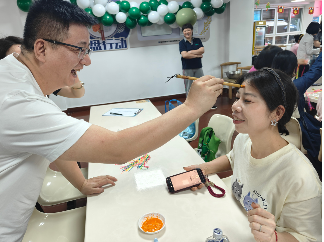 除了包粽子外,還組織了縫香包、編蛋袋、撞蛋、點(diǎn)額等形式多樣的活動。其中點(diǎn)額儀式則是端午節(jié)活動中的一項重要儀式?,F(xiàn)場擺放著雄黃酒和艾草制品,大家將雄黃酒點(diǎn)在額頭、耳后、手腕等處,雄黃酒香氣四溢、艾草清香撲鼻,構(gòu)成了端午獨(dú)特的氣息,這不僅是對傳統(tǒng)文化的尊重與傳承,更是讓我們在現(xiàn)代生活中仍感受到那份來自古代的智慧與關(guān)懷。
